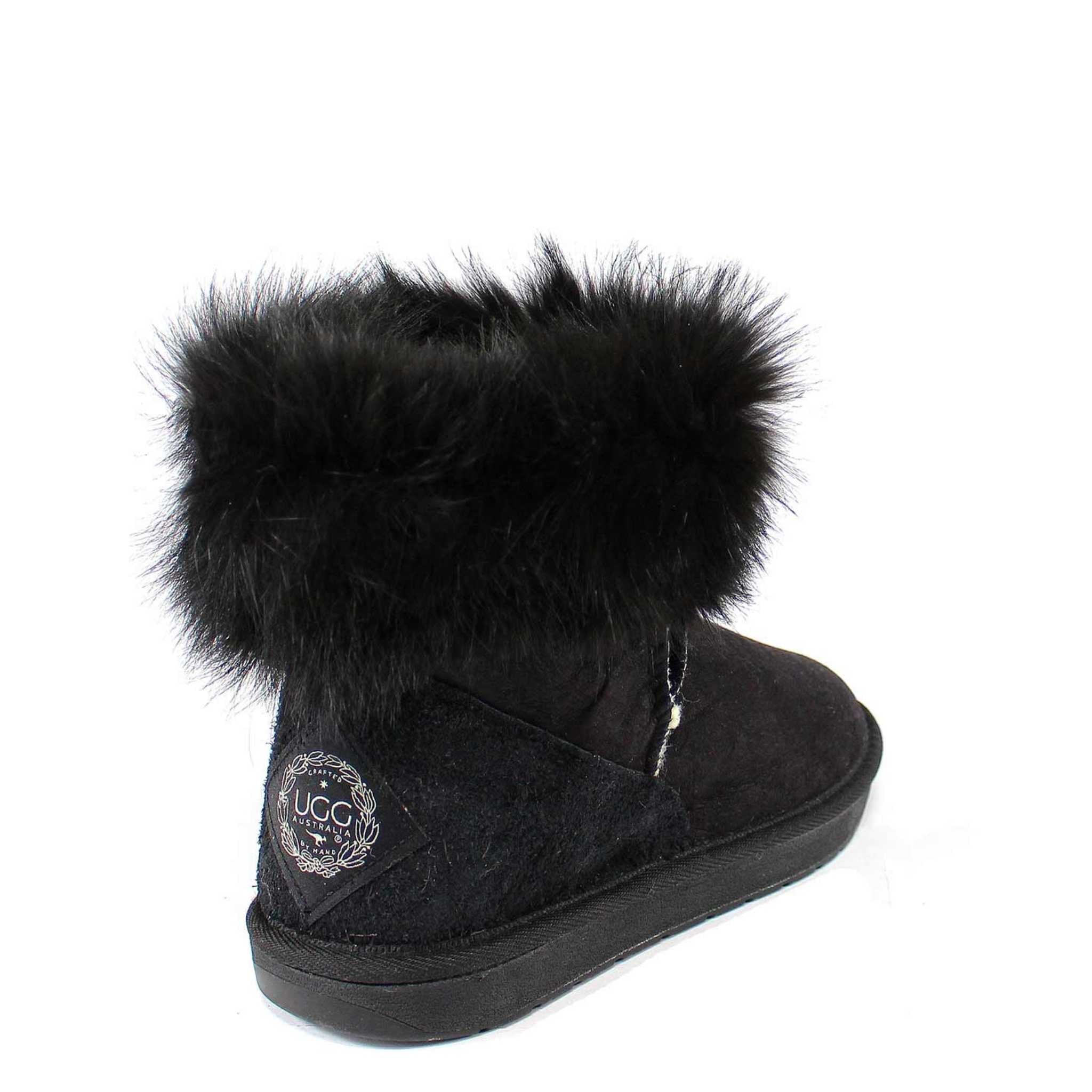 The UGG Australia® Premium Fox Mini Black is crafted with Australian merino double face sheepskin and finished with a luxurious ethically sourced Australian Fox cuff. This mini sheepskin boot features the high-density Eva sole for long-lasting, durable wear. A perfect hassle-free option with an easy pull tab for an active lifestyle that will keep your feet comfy and toasty.